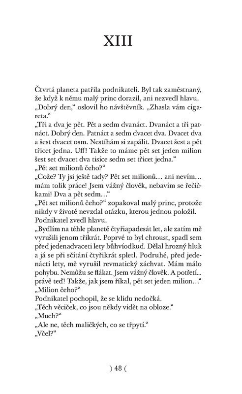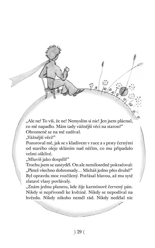 S Malým princem se v africké poušti setkává opuštěný letec, autor této knížky. Zatímco se pokouší opravit havarovaný stroj, povídají si o všeličem. O tajemství podivuhodné pouti Malého prince, o dobru a zlu, o přátelství a kráse, o pravém štěstí, o odpovědnosti za ty, které máme rádi. A vůbec...