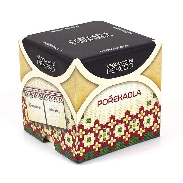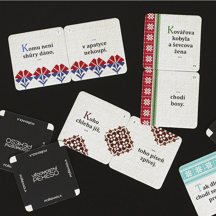 Hra vychází z klasického pexesa. Nehledají se však dva stejné obrázky, ale dvě informace, které k sobě patří. Díky vědomostnímu pexesu si můžete oživit znalosti pořekadel. Hra obsahuje: 48 kartiček (tj. 24 párů).