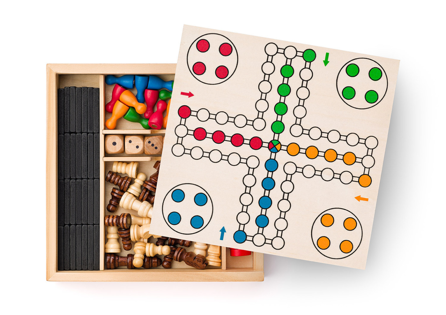 Soubor stolních her v dřevěném boxu, jehož víko tvoří oboustranná hrací deska pro jednotlivé společenské hry (šachy, dáma, člověče, nezlob se). Ke každé společenské hře najdete i příslušné figurky a hrací kosty. Součástí setu jsou i hrací kameny domina a sada hracích kostek. Magnetické provedení...