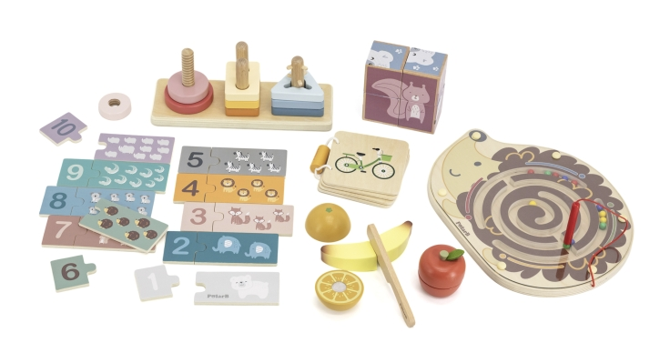 Dřevěné aktivity pro děti ve věku 24-36 měsíců. Vše pro rozvoj paměti a jemné motoriky. Sada obsahuje krájení ovoce, skládací kostky s obrázky zvířátek, knížku, navlékání tvarů, magnetický labyrint a puzzle s čísly. Rozměry balení 35x29,5x9,5 cm. Věk 24-36m