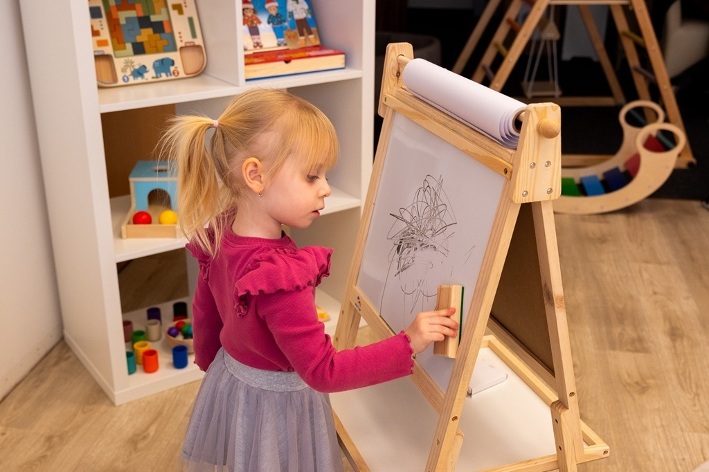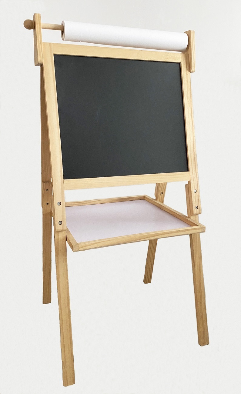 S touto velkou oboustrannou tabulí lze snadno rozvíjet kreativní umělecké dovednosti dětí. Z jedné strany magnetická tabule se suchým stíráním fixů, z druhé strany tradiční tabule pro křídu. Součástí je role papíru, fix, křídy a plstěná houba. Tabule je vybavena velkým