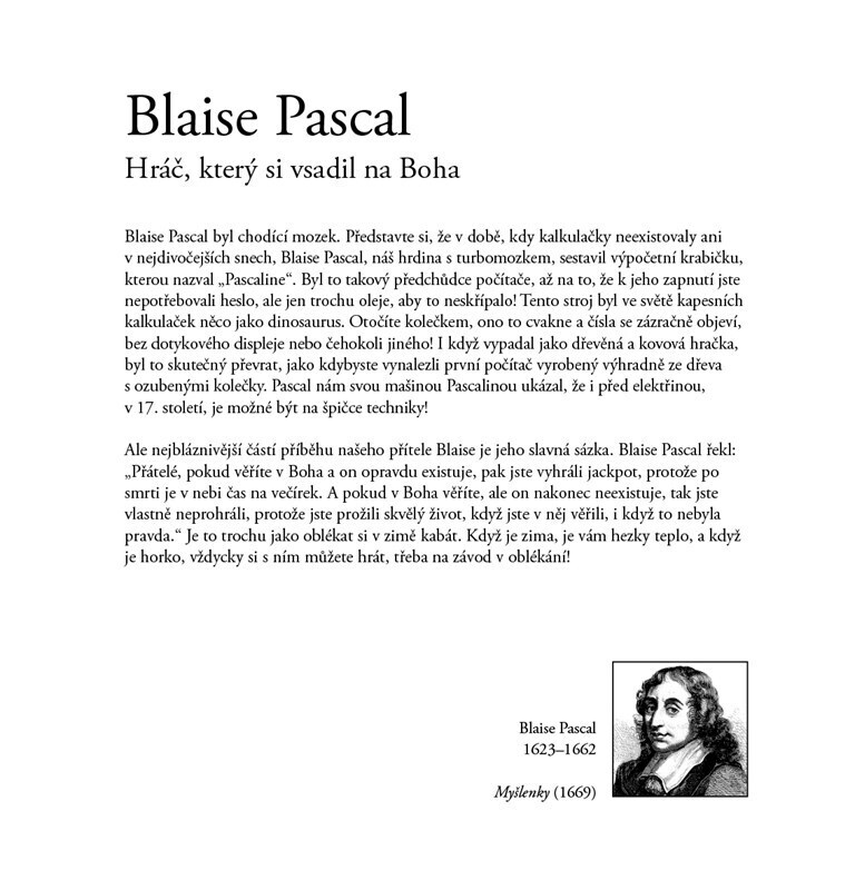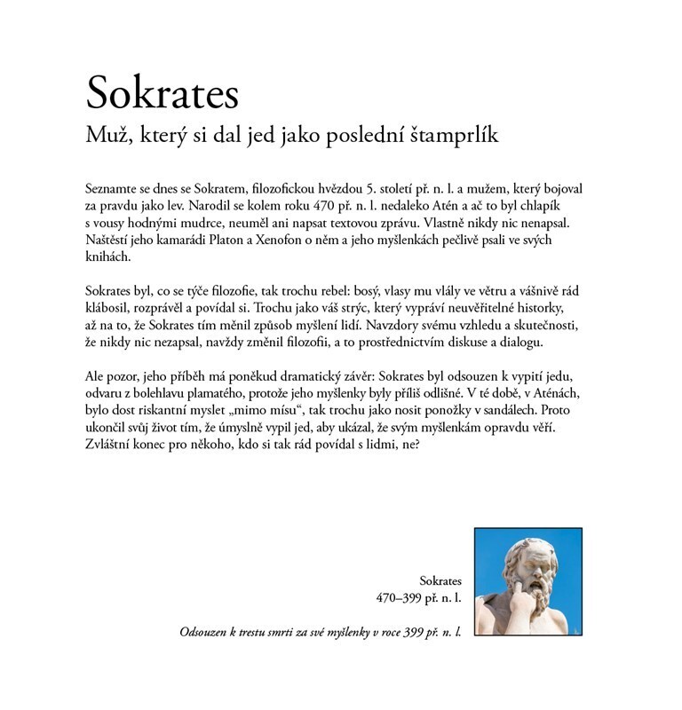 Pokud jste si mysleli, že filozofie je nuda, spletli jste se. Poznejte třicet lehce potrhlých filozofů (a filozofku) a užijete si s nimi bláznivou jízdu, během níž vám představí myšlenky, které se zapsaly do dějin. Trochu se zasmějete, trochu podivíte, a možná že si také začnete klást své...