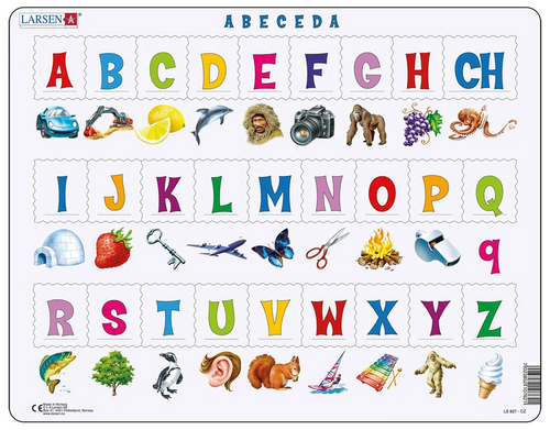 Deskové vzdělávací puzzle zobrazuje písmena české abecedy a k nim malou obrázkovou nápovědu. Věk: 4+