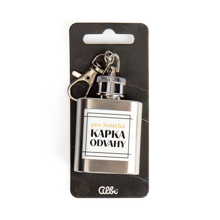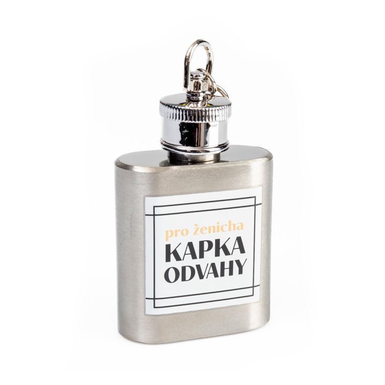 Mini placatka s nápisem "Kapka odvahy pro ženicha" má objem 30 ml.