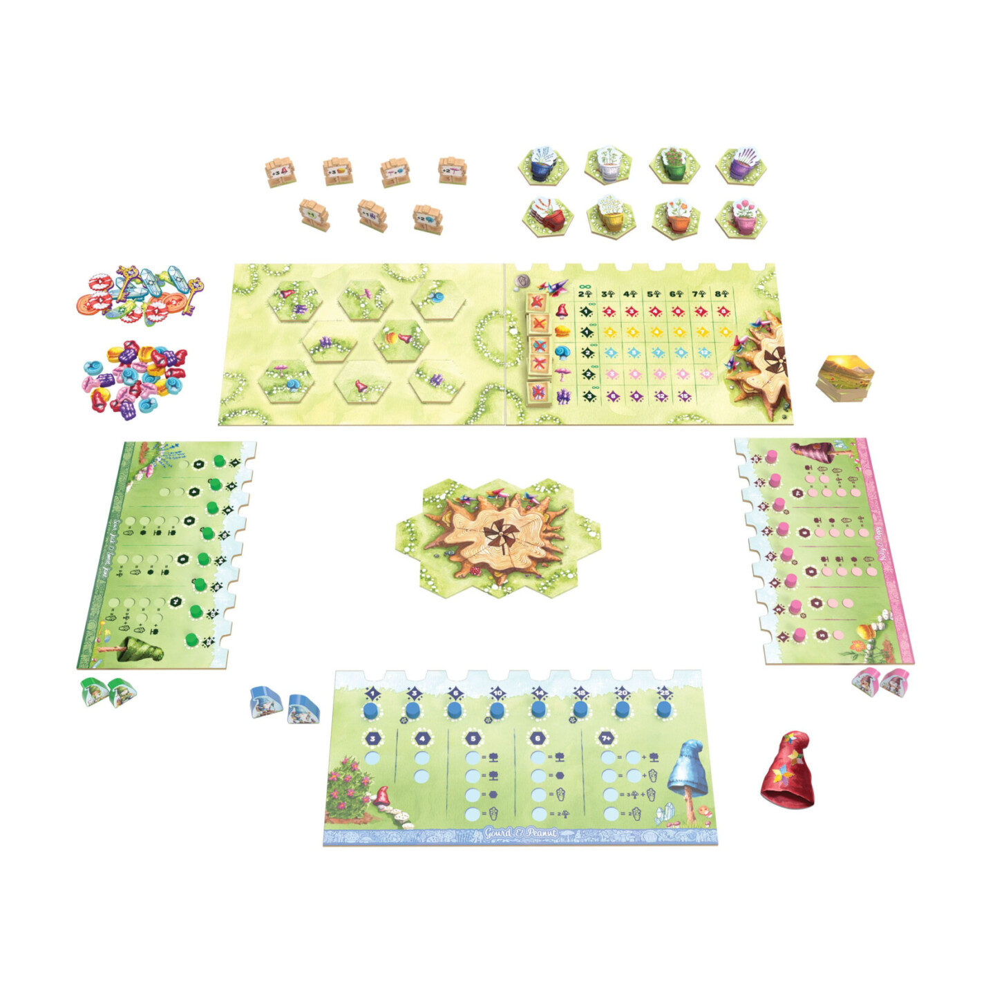 nosit vzácnou Červenou čapku – ovšem jen do příští sklizně! Obsah balení: 92 dílků zahrady 1 dílek pařezu 8 dílků divoké květeny 32 žetonů květin 1 dílek západu slunce 110 žetonů hub 57 žetonů pokladu 1 deska Větrníčkového trhu 1 deska dílků zahrady 1 deska obchodu