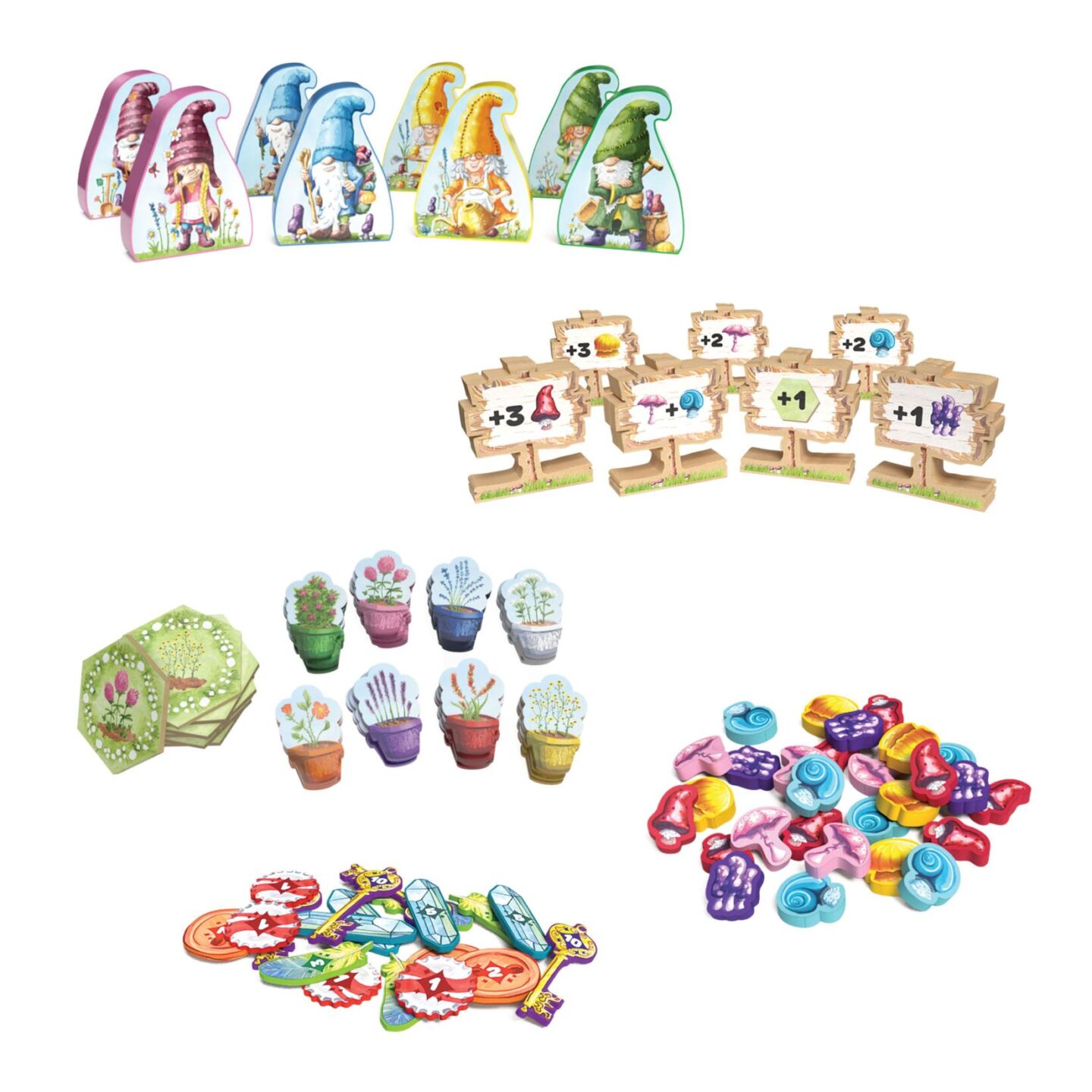 s houbami 21 žetonů Větrníčkového trhu 1 žeton prvního hráče 4 magnetické desky hráčů 4 přehledové karty 32 dřevěných kulatých ukazatelů čarokruhů 7 dřevěných ukazatelů 8 dřevěných trpaslíků 1 zatahovací látkový pytlík česká pravidla