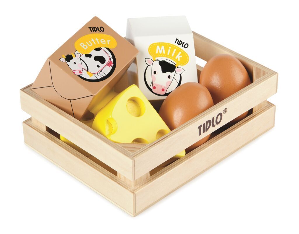 Tidlo Dřevěná bedýnka s mléčnými výrobky a vejci