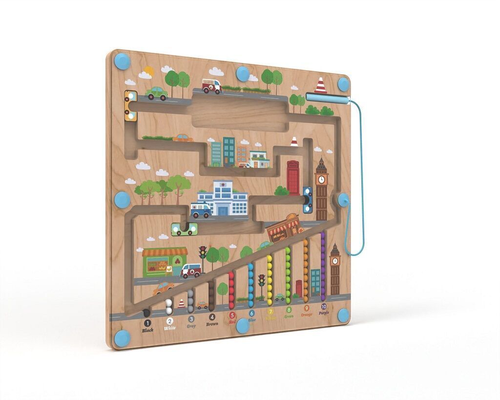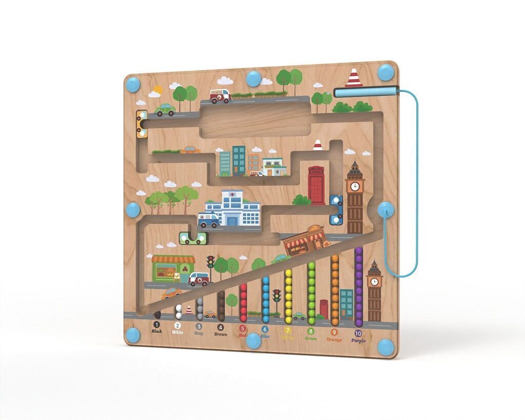 Vydejte se na cestu městem s barevnými kuličkami. Provedete úspěšně různobarevné kuličky všemi zákoutími? K převozu Vám pomohou barevné autobusy. K vedení kuliček se při hře využívá magnetické ukazovátko, které prověří dětskou trpělivost a koordinaci rukou a zraku. Dokážete pak navrátit kuličky...