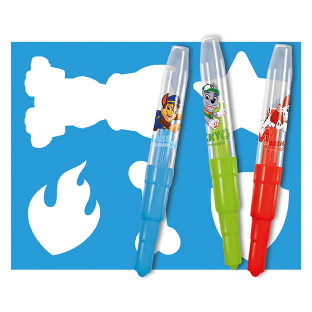 Balení obsahuje 10 barevných foukacích fixů s potiskem v oblíbených motivech a 1 šablonku.