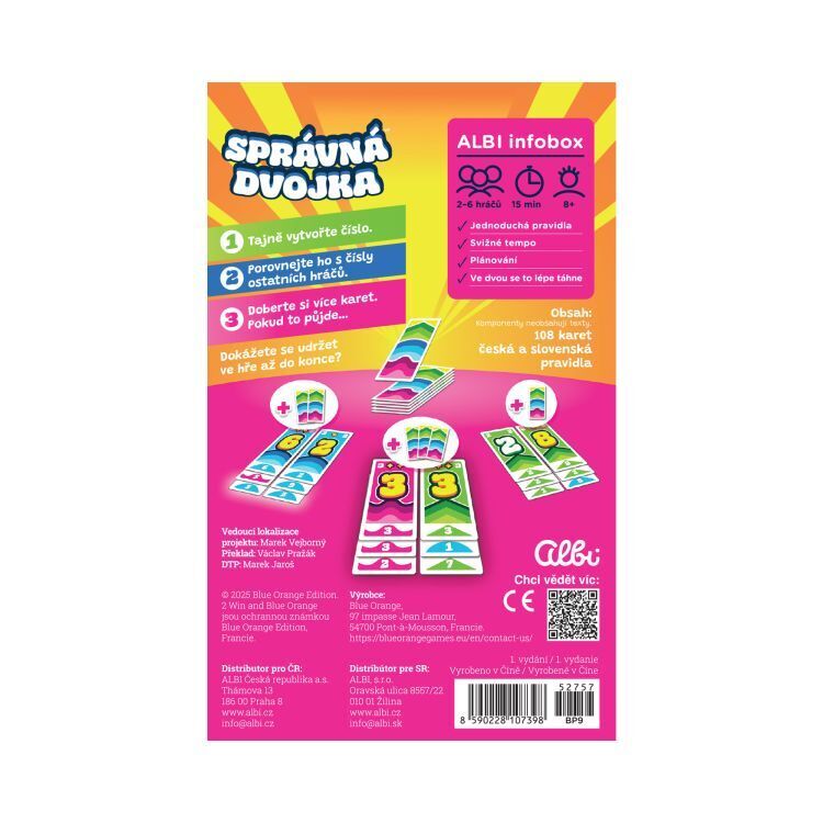 Napínavá karetní hra s čísly, ve které vyhraje ten, komu zůstanou karty nejdéle. Hra Správná dvojka obsahuje: 108 karet netradičního formátu, pravidla v českém a slovenském jazyce.