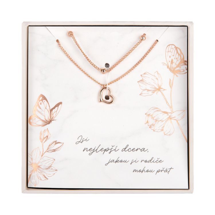 Dvojitý náhrdelník v oblíbené barvě rose gold je uložen v dárkovém balení s osobním věnováním. Upozornění: aby vám šperk dlouho vydržel jako nový, zamezte jeho styku s vodou a chemikáliemi. Materiál: měď Povrchová úprava: pozlaceno 18karátovým zlatem Délka řetízků: 45 cm, 40...