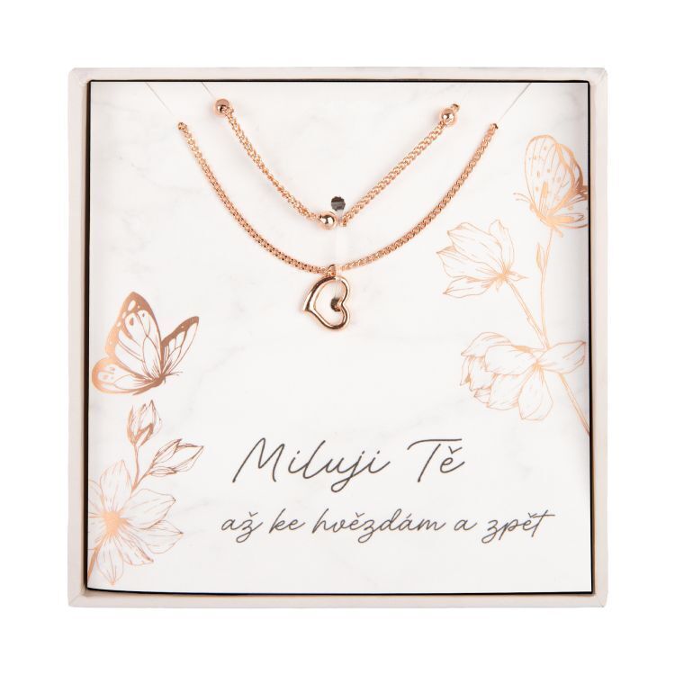Dvojitý náhrdelník v oblíbené barvě rose gold je uložen v dárkovém balení s osobním věnováním. Upozornění: aby vám šperk dlouho vydržel jako nový, zamezte jeho styku s vodou a chemikáliemi. Materiál: měď Povrchová úprava: pozlaceno 18karátovým zlatem Délka řetízků: 45 cm, 40...