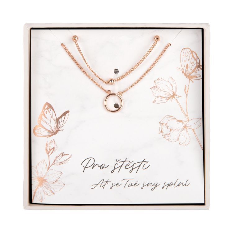 Dvojitý náhrdelník v oblíbené barvě rose gold je uložen v dárkovém balení s osobním věnováním. Upozornění: aby vám šperk dlouho vydržel jako nový, zamezte jeho styku s vodou a chemikáliemi. Materiál: měď Povrchová úprava: pozlaceno 18karátovým zlatem Délka řetízků: 45 cm, 40...