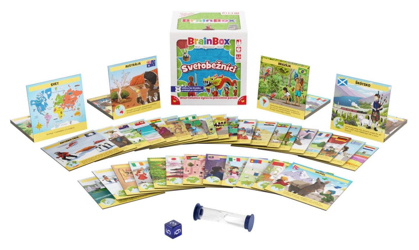 BrainBox Světoběžníci obsahuje 55 hracích karet s ručně malovanými ilustracemi, které vám doslova oživí každý pohled na danou zemi. Hra pomáhá dětem dozvědět se více o úžasných zemích naší planety a jejich obyvatelích, a přitom rozvíjí kognitivní dovednosti, jako je