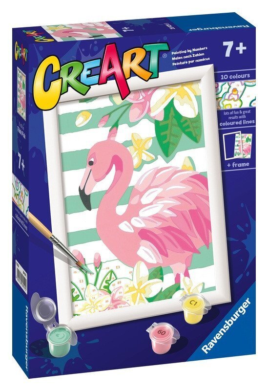 CreArt - to je kreativní zábava doslova pro každého. Staňte se na chvíli profesionálním malířem a namalujte si svůj vlastní obraz. Tento nádherný růžový plameňák rozzáří každou zeď. Postupně vybarvujte jednotlivé plochy podle návodu (každé číslo na plátně