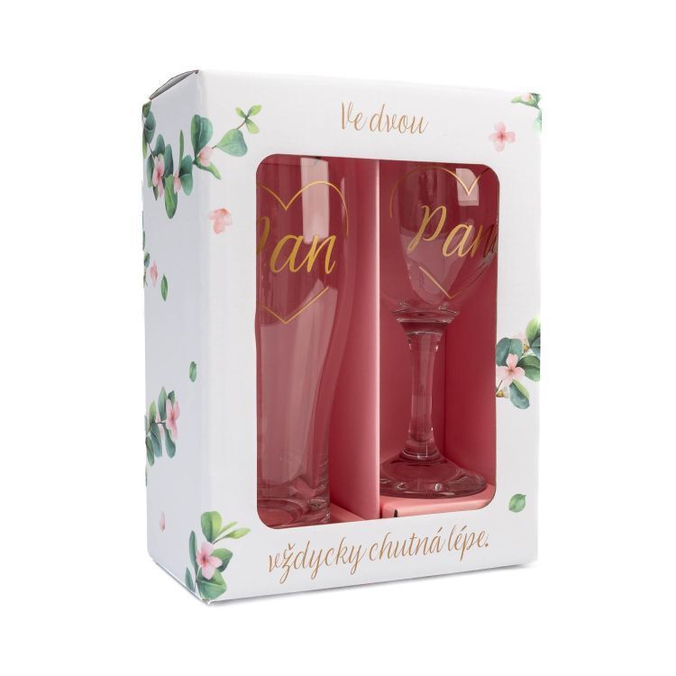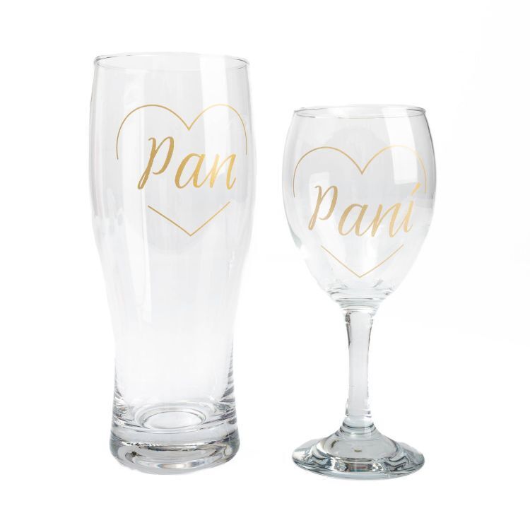 Sada sklenky na víno s půllitrem s potiskem pro novomanžele. Objem: sklenička na víno 220 ml, na pivo 500 ml