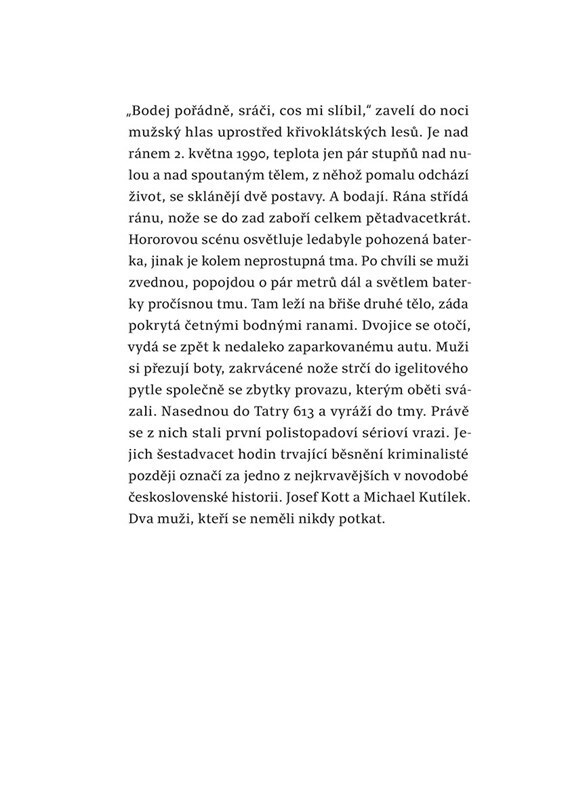 Proč se Kott s Kutílkem vydali na smrtící jízdu, během níž připravili o život čtyři lidi? Bylo to dílo Satanovo? Kdo byl jedním z nejmladších vrahů československé historie a co provedl se svým společníkem? Z jakého důvodu mladiství fanatici do bojových sportů vyvraždili celou rodinu? Autoři...