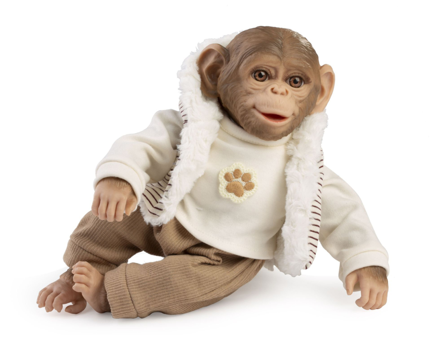 Veselé a roztomilé opičí miminko bez zvuku s měkkým látkovým tělem. Hlava a končetiny jsou vyrobené z kvalitního vinylu. Ruce a nohy jsou k tělu přichyceny kloubem. Opičí miminko je polohovací a může i sedět nebo se dá pověsit za ruce nebo nohy. Velikost 32 cm. Ručně vyrobeno ve Španělsku,...