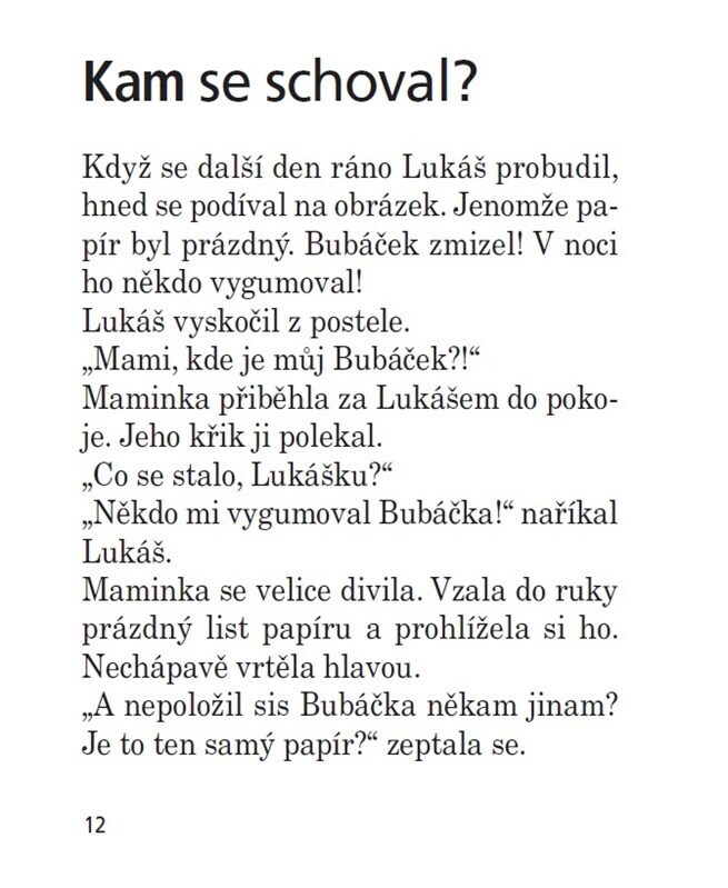 Lukáš má rád pohádky o strašidlech. Ale všechny už mu maminka před spaním vyprávěla. Co teď? Musí vymyslet nějakou novou – o Bubáčkovi. Tatínek ho Lukášovi pak pěkně nakreslil. Když se však Lukáš druhý den ráno probudí, Bubáček je pryč! Večer, když smutný Lukáš už leží v posteli, se v pokojíčku...