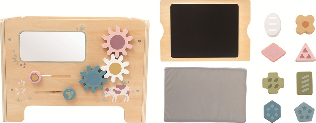 hlavičky. Labyrint se zvířátky, vkládací tvary, ozubená kolečka, hodiny, zrcátko… Tahle stolička je malá, ale neskutečně akční. A k tomu všemu laděná do přírodních a pastelových tónů, takže se stane i atraktivním doplňkem dětského pokoje či herny. Stolička je