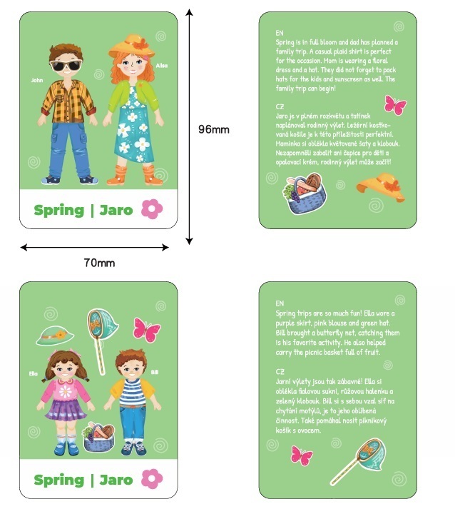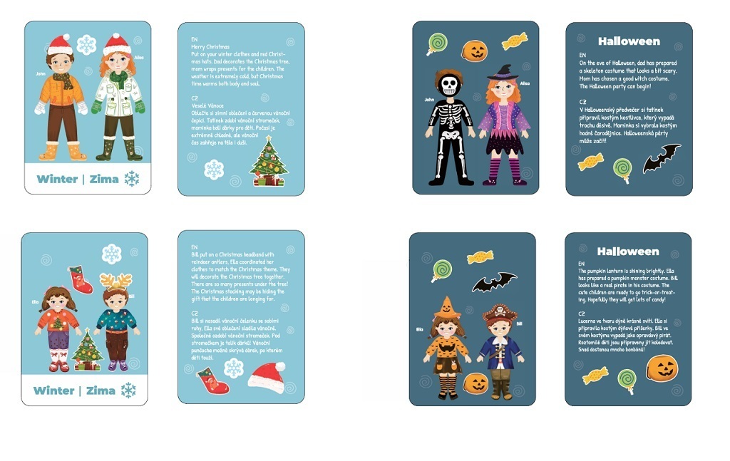 oblečení a doplňků8 oboustranných kartiček s příběhy v češtině a angličtině (jaro, léto atd.)rozvíjí jemnou motoriku, fantazii a poznávání ročních obdobípro děti od 3 letideální pro hru doma i na cestách