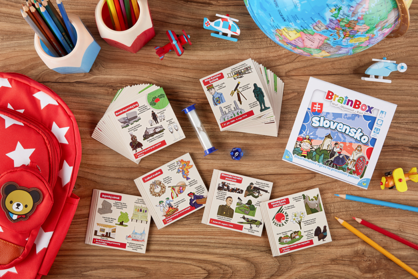 každá reprezentuje iné miesto, okres, osobu alebo okamih z minulosti alebo súčasnosti Slovenska. Karty sú ručne ilustrované, výjavy na nich sú ako skutočné a sú doplnené o významné skutočnosti súvisiace s daným okamihom v dejinách Slovenska. Hra pomôže deťom učiť sa o vlasti