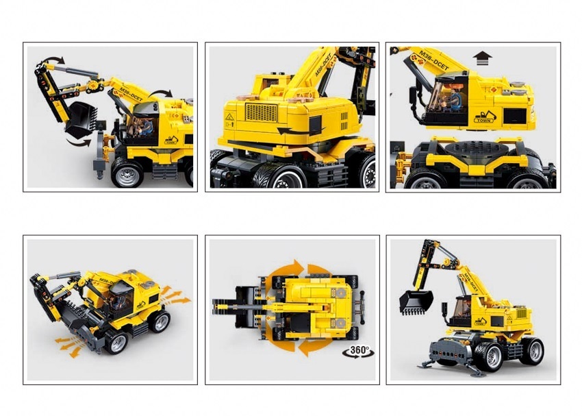 - E7 Kolové rypadlo M38-B1155 je stavebnice, která obsahuje 196 dílků a 1 figurku. Ale co ji dělá tak oslnivou? Je inovativní s otáčivými i výkyvnými částmi. Tato stavebnice je kompatibilní se stavebnicemi ostatních významných výrobců, což znamená nekonečné kombinace a hodiny