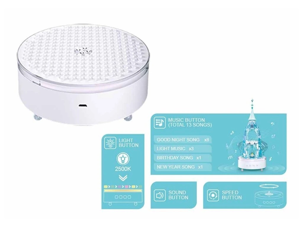Nechte se unášet příjemnými melodiemi a užijte si zimní atmosféru! Poskládejte si Zimní království, zapněte osvětlení, zaposlouchejte se do jedné ze 13 skladeb a sledujte, jak se palác z modrého ledu otáčí v rytmu známé hudby. Můžete si vybrat z několika ukolébavek či