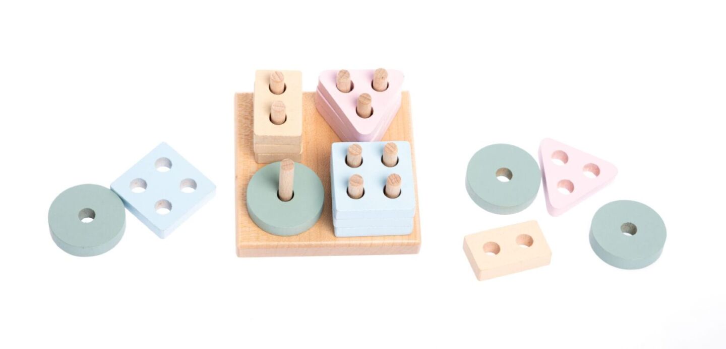 perforovanými geometrickými tvary, které se umísťují na čtvercovou základnu. Jednotlivé tvary mají i své opakující se barvy, které se děti touto hrou také učí rozlišovat. Sortiment hraček značky CUBIKA pomáhá dětem rozvíjet především senzomotorické schopnosti a