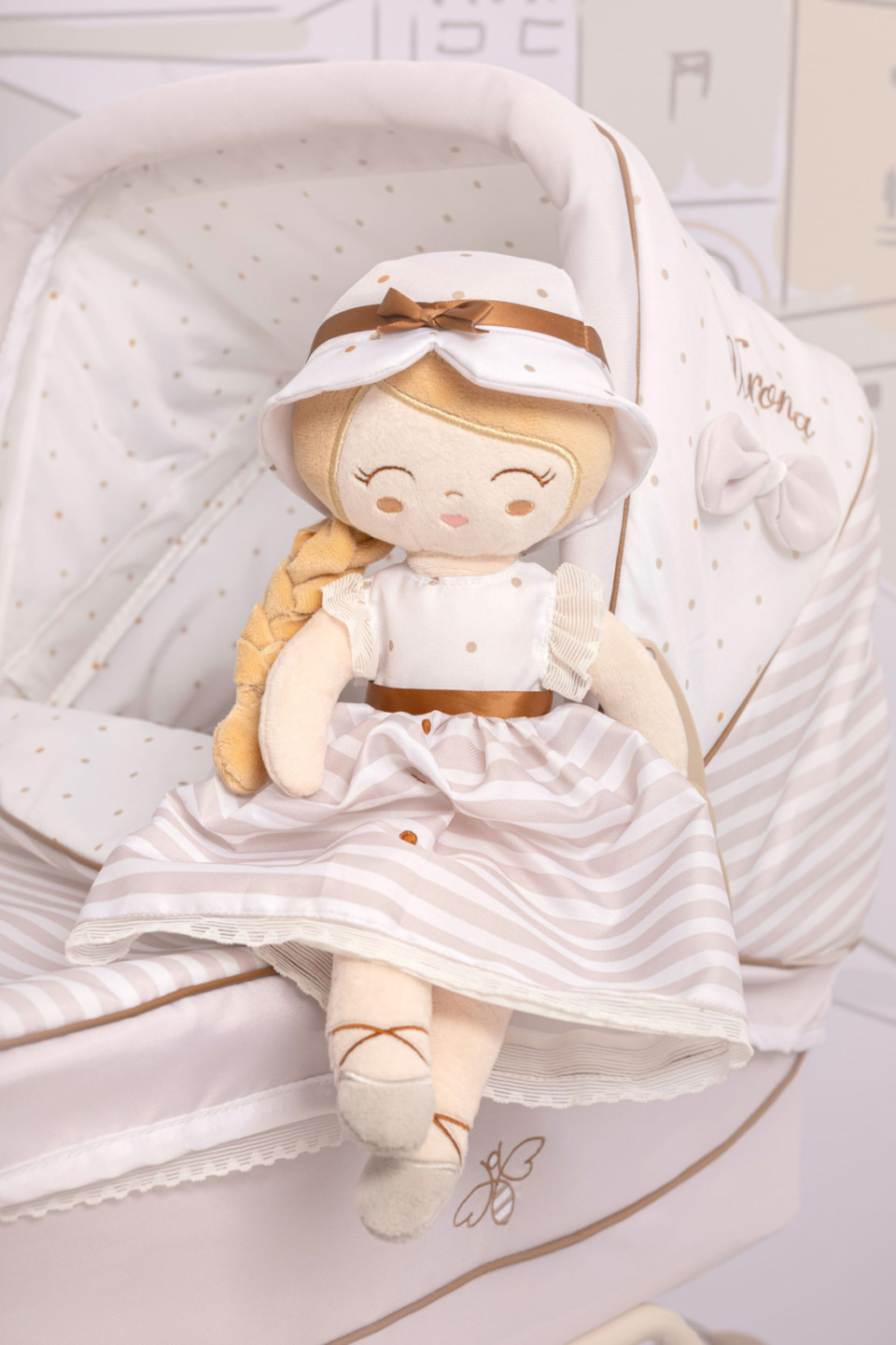 bílé s roztomilými puntíky nebo proužky doplňuje světle hnědé úzké lemování, které zdůrazňuje dokonalost tvarů a krásně ladí s hnědými madly kočárků. Přírodní styl kolekce podtrhují aplikace mašliček zobrazující okvětní lístky a drobné výšivky včeliček.