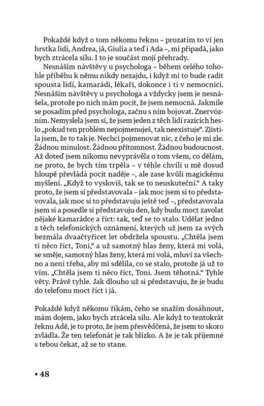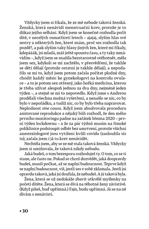 Antonella se na mateřství dlouhé roky necítí. Když pak touha po dětech konečně přijde, její tělo odmítne spolupracovat. A tak se roztáčí kolotoč posedlosti, umanutosti a nekonečného přívalu medikamentů. Syrový příběh pro všechny ženy, které si v různých fázích života položily otázky: Chci dítě?...