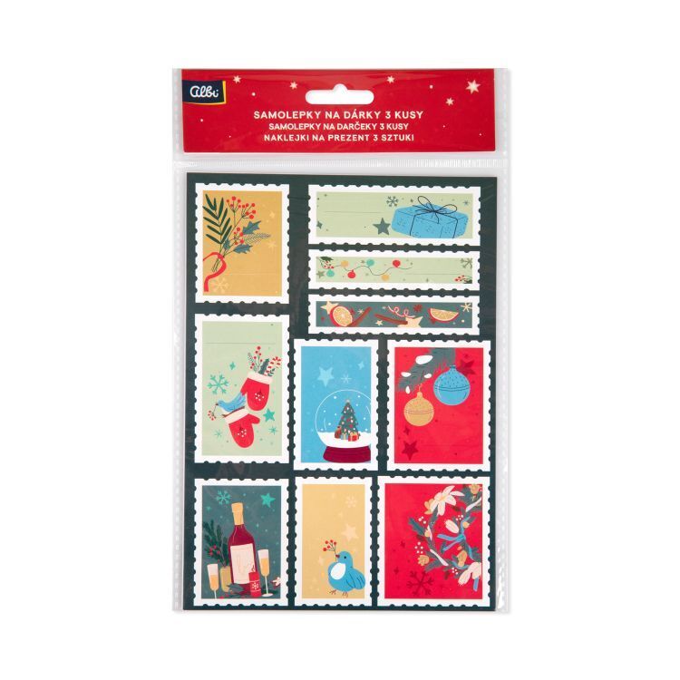 Sada 3 archů samolepek na dárky ve tvaru poštovních známek, které poslouží jako jmenovky či ozdoby. Rozměry archů: 14,8 × 21 cm