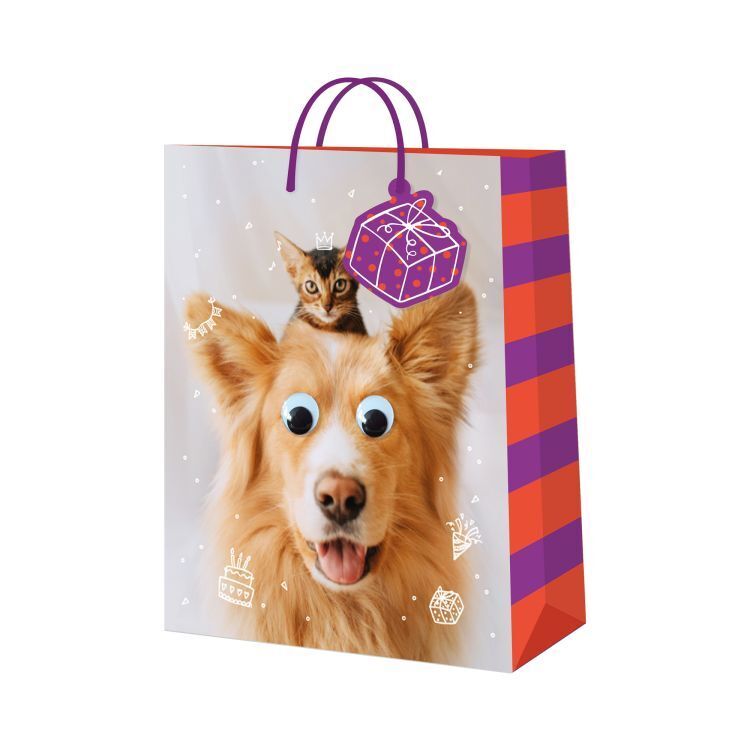 Střeštěná papírová dárková taška s pejskem a kočičkou s přilepenýma koulícíma očima. Rozměry: 26 × 12,7 × 32,4 cm