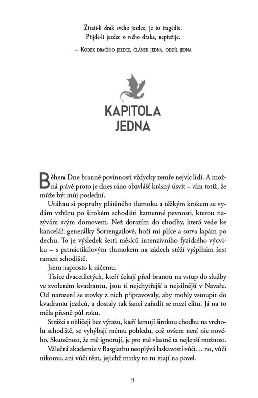 Dvacetiletá Violet Sorrengailová měla nastoupit do kvadrantu písařů a strávit život mezi knihami. Její matka, nesmlouvavá velící generálka, jí však nařídí, aby se připojila ke stovkám kandidátů toužících dostat se mezi navarrskou elitu: dračí jezdce. Violet chybí trénink, navíc je menší než...