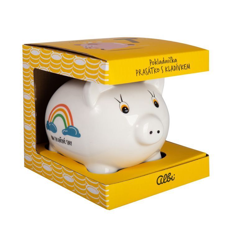 Klasické pokladničky ve tvaru prasátka s milým věnováním potěší všechny šetřílky. Součástí balení je i kladívko, které vás k vytoužené částce nakonec dostane. Materiál: Porcelán Rozměry: 14 cm × 15 cm × 16 cm