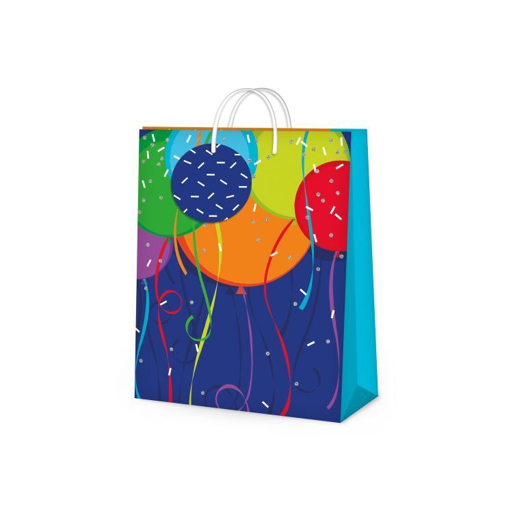 Papírová dárková taška s univerzálním motivem veselých balónků a konfet je vhodná na zabalení dárku pro ženy, muže i děti. Rozměry: 17,8 × 9,8 × 22,9 cm