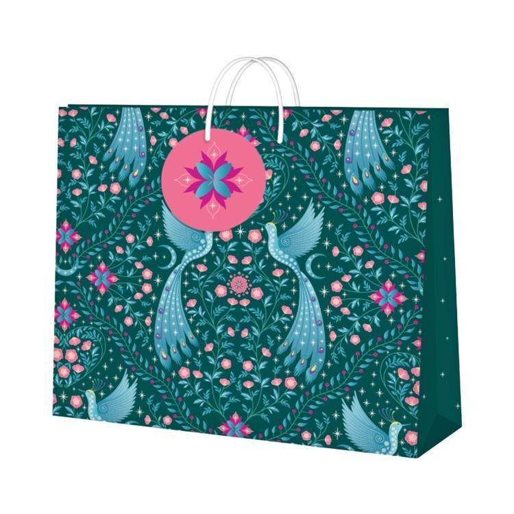 Široká elegantní papírová taška s motivem pávů. Rozměry: 32,4 × 12,7 × 26 cm (šířka × hloubka × výška)