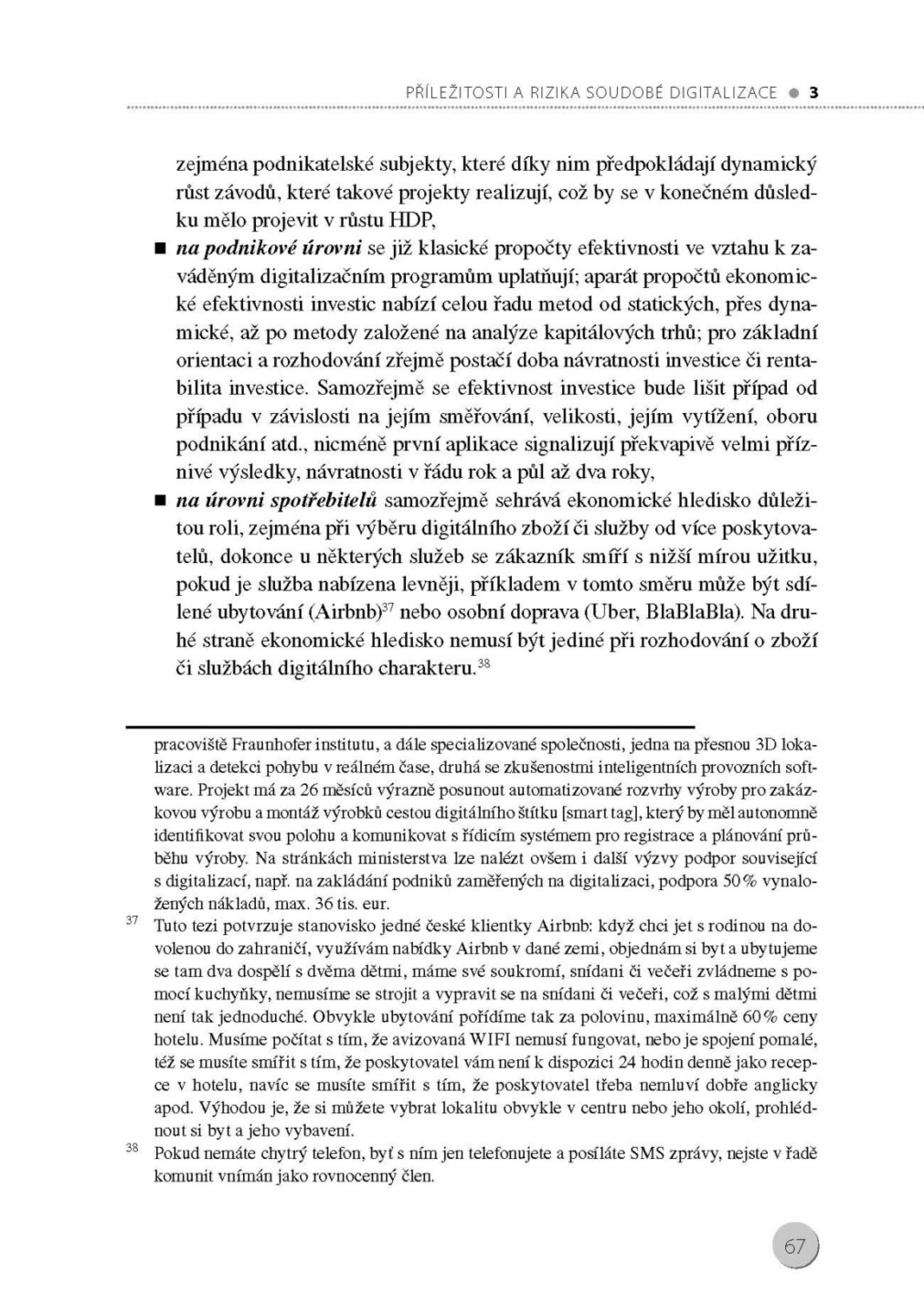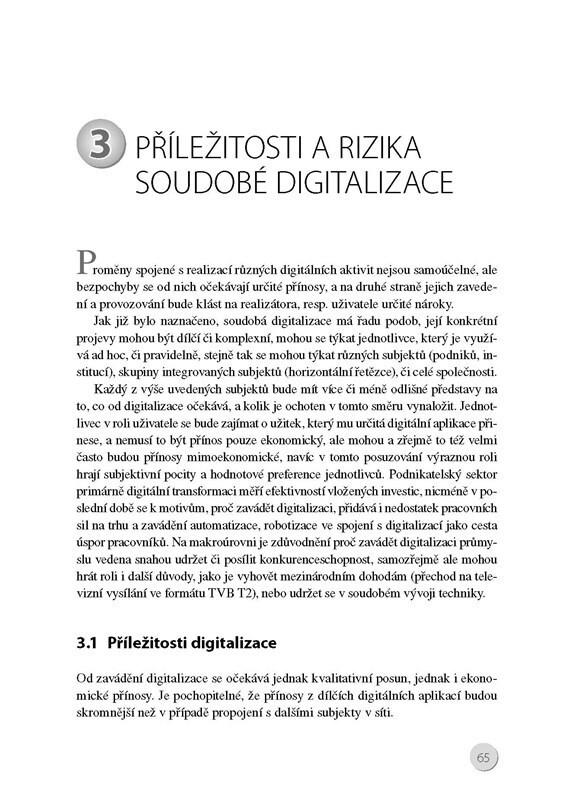 Autoři se snaží naznačit klady i úskalí digitální transformace, jichž jsme svědky v ekonomice i celé společnosti. Věnují se jednak novým projevům digitalizace, jako jsou sdílená ekonomika či sociální sítě, jednak jejímu uplatnění v tradičních segmentech ekonomiky,