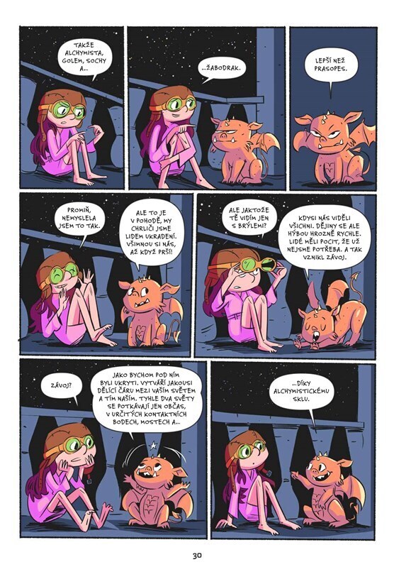 Stella se právě přestěhovala do centra Prahy a je z toho pěkně otrávená. Škola nic moc, město je jedna velká nuda – staré domy, oprýskané fasády a všude sochy. Jenže pak na půdě najde něco, co jí otevře oči… a vstup do jiného světa. Sochy mluví, chrliči chrochtají smíchy a atlanti si stěžují na...