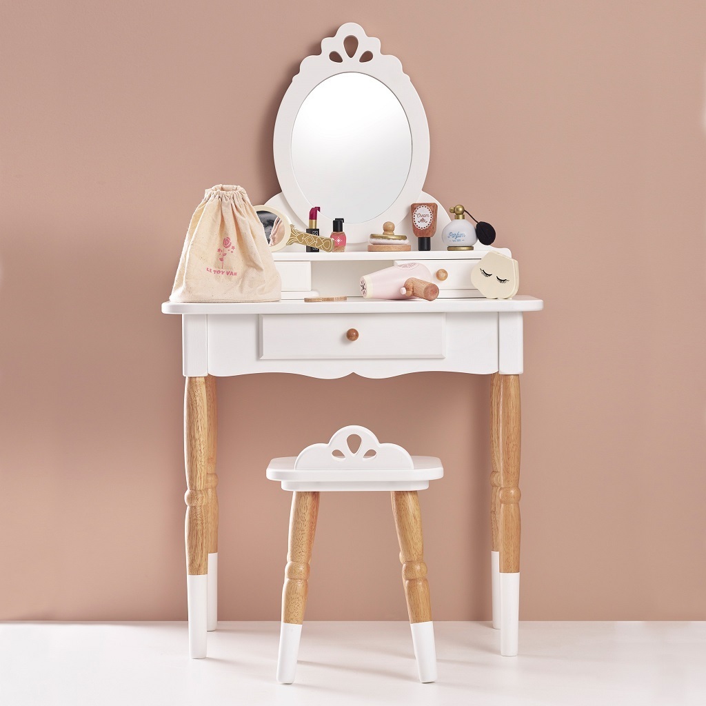 Krásný toaletní stolek v retro stylu, jistě naplní sny nejednoho dítěte. Bude se vyjímat v dětském pokoji nebo herně, je velmi elegantní a při hře opravdu upoutá pozornost dětí. Viktoriánské oválné zrcadlo z prvotřídního, nerozbitného akrylátu, dvoupatrový stolek, 3