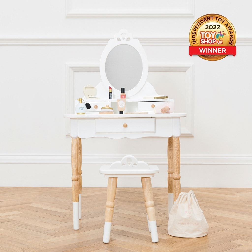 vzhled. Krásný nábytek si můžete předávat z generace na generaci. Hlavní vlastnosti: toaletní stolek s židlípro děti od 3 do 6 letmaximální nosnost 50 kgvyrobeno eticky z udržitelného dřevamalováno netoxickými barvami na bázi vody Ocenění hračky:Independent Toy Gold Award