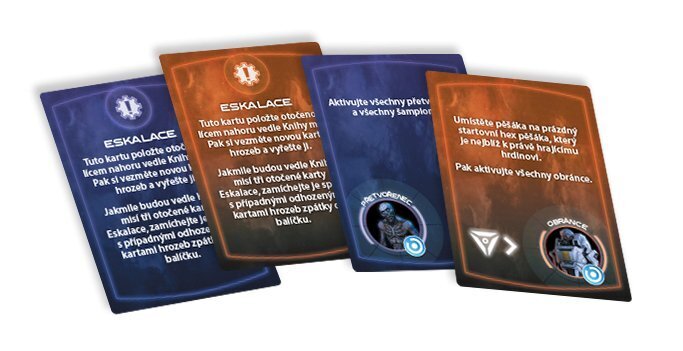 kampaně 6 figurek hrdinů 5 desek hrdinů 12 strategických kostek 2 paragonové kostky 64 karet hrozeb 86 žetonů nepřátel 93 herních žetonů 15 ukazatelů 1 sáček 1 fix česká pravidla