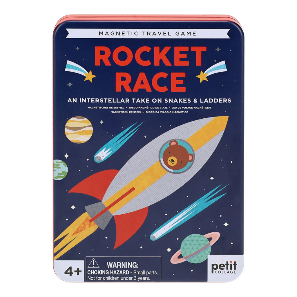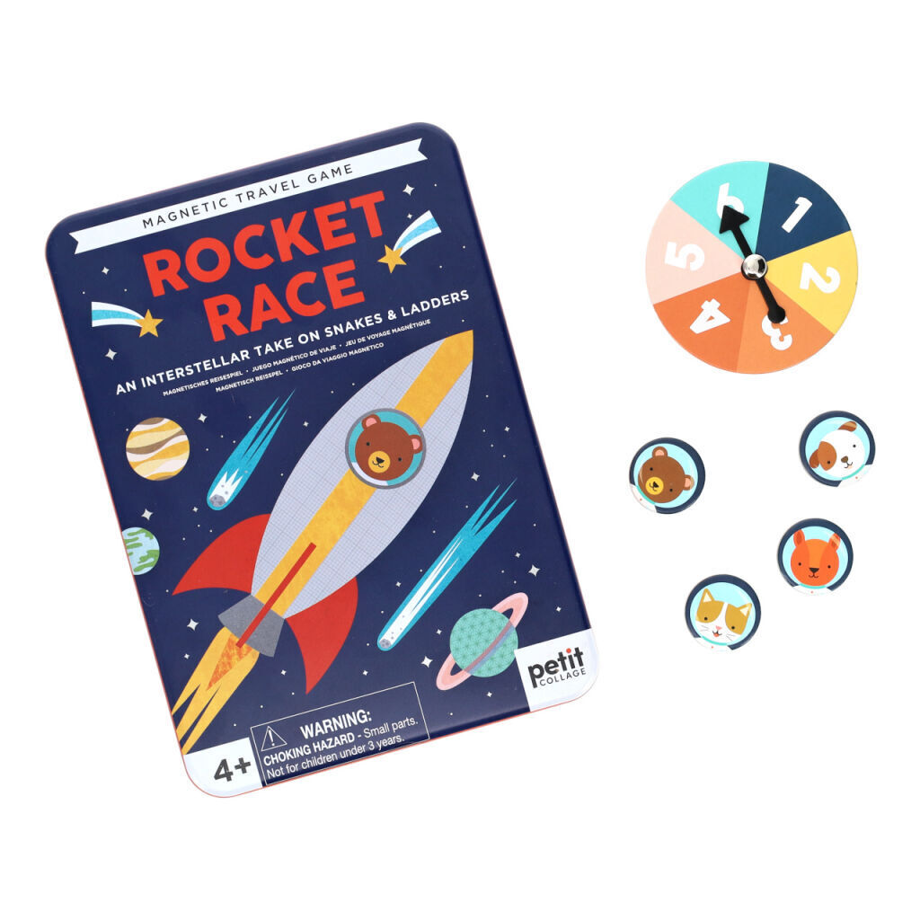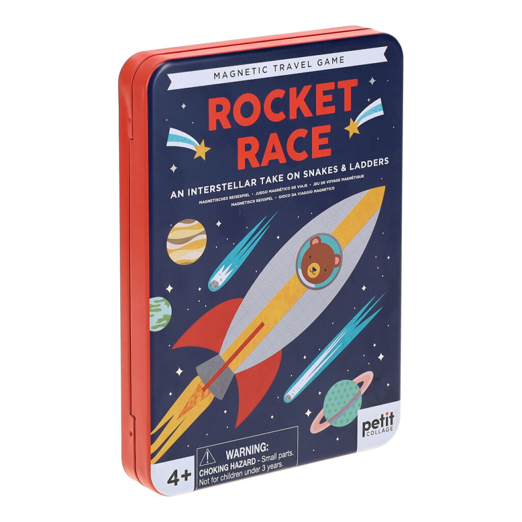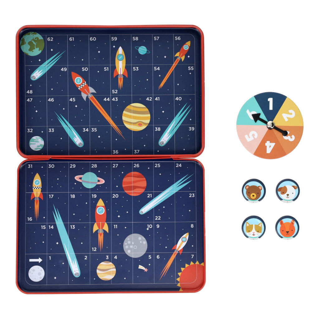 Odstartuje tento vesmírný závod! Zábavná hra v kovové krabičce plná veselých ilustrací. Hra je vesmírnou verzí Hadů a žebříků. Střídejte se v otáčení kolečka s šipkou, to ukazuje, o kolik polí se posunete. Pokud se zastavíte na políčku s hořícím palivem rakety, posuňte se vzhůru na tělo rakety....