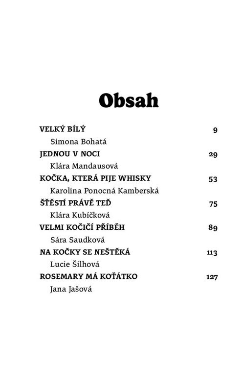 Kolik má kočka životů? To nikdo neví přesně, ale každá z autorek této sbírky nadělila kočkám alespoň jeden navíc. Simona Bohatá, Jana Jašová, Klára Kubíčková, Klára Mandausová, Karolina Ponocná Kamberská, Sára Saudková a Lucie Šilhová se s grácií šelmy pouštějí do příběhů inspirovaných tvory,...