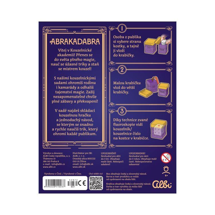 Kouzelnický trik, při kterém kouzelník uhádne číslo na kostce schované v krabiččce. Sada obsahuje skládací kouzelnou hračku (kostku, velkou krabičku, malou krabičku) a jednoduchý návod. Obtížnost: lehká (1/3) Materiál: plast Rozměry velké krabičky: 3,3 × 3,3 × 4,3 cm