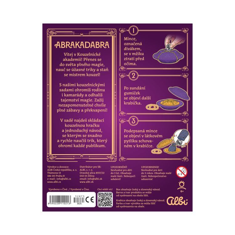Kouzelnická rekvizita, se kterou může malý kouzelník či kouzelnice nechat zmizet minci a objevit ji zavřenou ve dvojitém trezoru. Sada obsahuje velký trezor, malý trezor, trychtýř, pytlíček, 5 gumiček a jednoduchý návod. Obtížnost: těžká (3/3) Materiál: plast Rozměry velkého trezoru: 8 × 8 × 2,5...