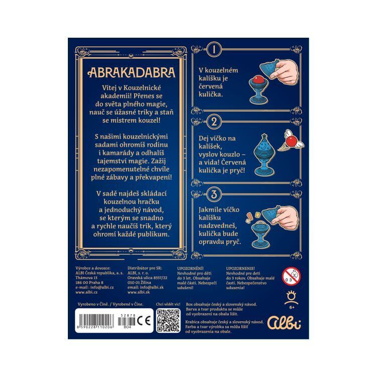 Kouzelnická rekvizita, ve které je v kalíšku červená kulička. Často se z něj ztrácí a poslušně se do něj opět vrací jen díky kouzlení. Sadaobsahuje skládací kouzelnou hračku (víčko kalíšku, podstavec kalíšku, polokulovitou skořápku, červenou kuličku) a jednoduchý návod. Obtížnost: lehká (1/3)...