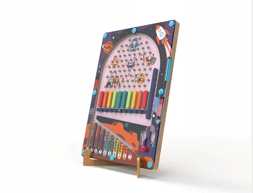 Originální dřevěná hra s vesmírným motivem nabízí dětem hned dvě možnosti, jak si užít spoustu zábavy: klasický pinball s vystřelováním kuliček a magnetickou hru se sbíráním bodů. Barevná hrací deska je navržena tak, aby podporovala zručnost, soustředění a