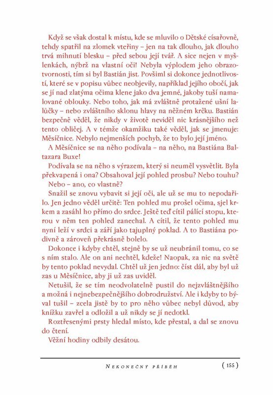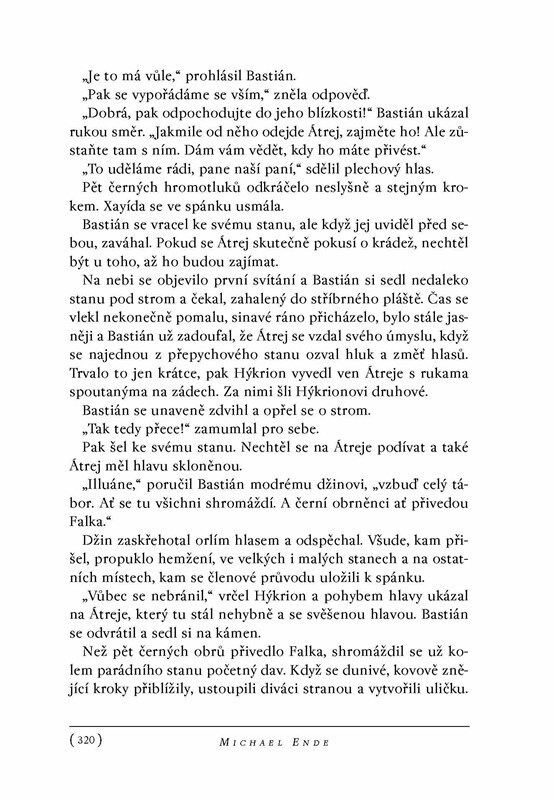 Příběh o tlouštíkovi Bastiánovi, nesmělém a všemi spolužáky vysmívaném chlapci, synovi nikoho, zavede čtenáře do zvláštního světa. Je jím Fantázie a Bastián se do ní dostane skrze stránky neméně zvláštní knížky. Spolu s chlapcem Átrejem – synem všech – prožije na Veliké Cestě Hledání četná...