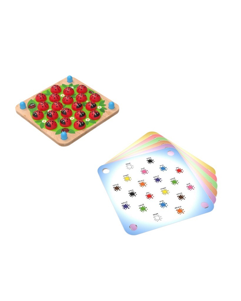 karta, má na sobě barevné skvrny s anglickými názvy barev. Všechny karty jsou oboustranné. Pravidla hry: Vyberte si jednu z hracích karet. Zasuňte kartu mezi 2 dřevěné desky. Umístěte na obrázky přiložené berušky. Hra pokračuje jako klasické pexeso – hráč v každém kole